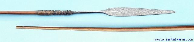 A throwing spear of the Zulu, known for their accuracy for hunting and as weapon of war. 47 ½ inches long slightly bent haft, 15 ½ inches blade held in place by hide binding. Very good condition. Very attractive price.