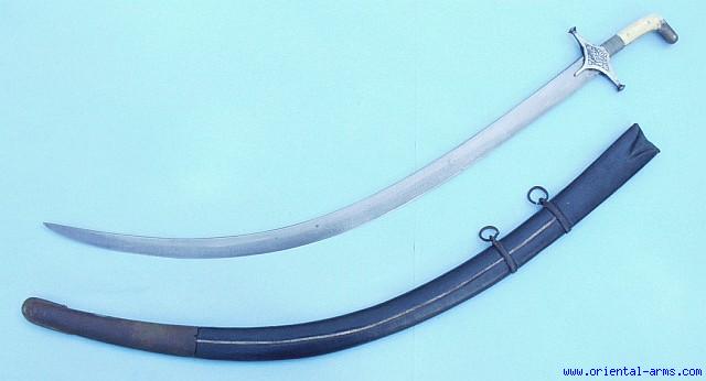 A Shamshir, the Eastern saber that for centuries enchanted the world and was copied in practically all armies of the western world. A heavy deeply curved, wedge shape blade of minimal and simple design and yet a lethal slashing weapon in the experienced hand. Here we offer for sale a classical example. A 31 inches blade forged from fantastic watered steel (Wootz, Damascus), steel cross guard chiseled with Arabic inscription, Walrus ivory grips bound with twisted silver wire and steel pommel. Total length 37 inches. Very good condition. Minor blackened spots on the blade. An old crack on the right side grip but hold solid. The pommel cap is a later addition. Newly made scabbard. |