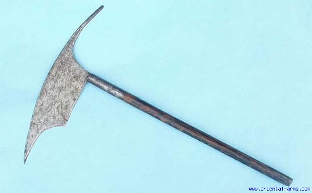 The most known weapon associated with head hunting of the Filipino tribes is the Head Axe. It is characterized by its specific blade shape with the long rear projection. Beside warfare, It was also used as a multipurpose cutting tool, worked in a very peculiar way: The long rear spike was driven in the ground, holding the axe in place edge up, and the cut object was drawn along the edge. We offer here for sale a classical example , probably Kalinga tribe, 14 inches blade (Point to point) with concave edge, on a 17 inches haft with a steel ferrule. Very good condition. |
