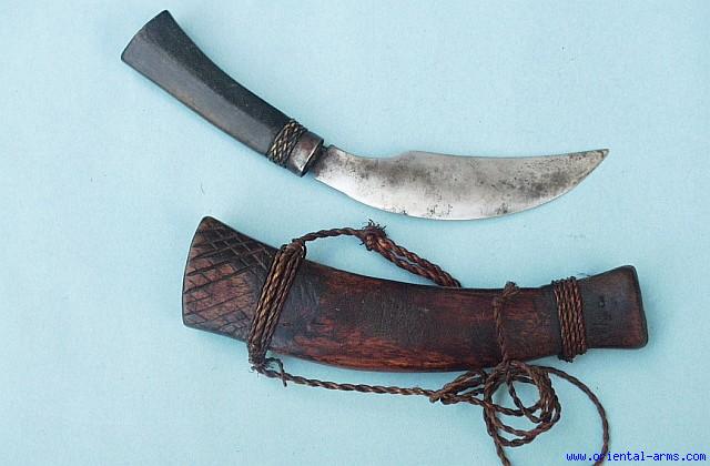We offer for sale this knife of the Bagobo tribe, Mindanao, Philippines usually known as women’s knife. The blade is up-curving 5 inches long, single edge at the convex side. The hilt is black horn. The angle of the blade to the hilt allow to hold the knife only with the edge upside or in the direction of the holder. Wood scabbard bound with braided fibers, with the original fiber/rope used to carry it. Very good condition. |