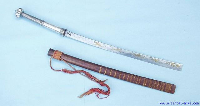 A very unusual two handed fighting sword Dha from Thailand with unusual blade. The slightly curved heavy blade is 24 inches long, with a square tip Inlaid with brass inscription and hunting scene images. The grip is 12 inches long covered with silver with a big onion shape pommel (classical Thai style). Wood scabbard also bound with braided rattan bands and red cord. Very good condition. Minor dents on the grip amd few of the rattan bands on the scabbard are missing. Sword with of quality, probably early 20th. Century. |