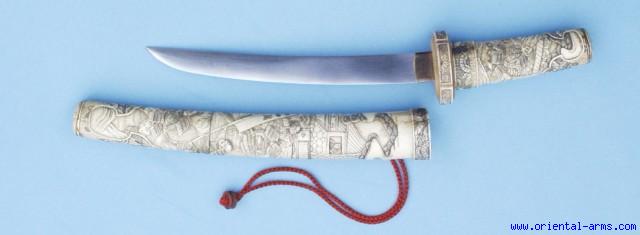 Beautiful and very decorative Japanese bone dagger. 9 Inch blade, 16 inches overall length in an engraved bone sheath, very delicately engraved allover with scenes from the Samurai life (?) in great details. Not very old, may be early 20th C and not a weapon but an exquisite piece of Japanese art. Excellent condition. |