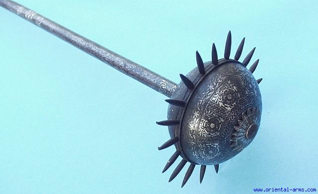Once again we offer to the collector of Indo-Persian arms and armor a very unusual piece: This spiked Ceremonial War Mace. The globular hollow head is 4 inches wide, 3 inches high, mounted with 20 steel spikes all around. The haft is steel 27 inches long. Both the head and the haft are decorated with silver koftgari design. Good condition. A small hole in the lower part of the head. Small part of the silver koftgari is lost. |