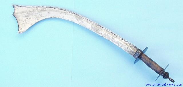 Kora swords were used in Nepal and North India for both fighting and sacrificial processes. They are quite similar, only the sacrificial sword is wider and heavier. This one is basically a fighter of very good quality but the blade dimentions are so that it can also be used for sacrificing. Heavy, down curving, blade, with its deadly sharp edge on the concave side and with wide heavy tip. This one has a 21 inches blade, 5 ˝ inches at the tip. The tip is marked with the “Eye” talisman marking, and the spine is marked with numbers. Total length 26 ˝ inches. It is of a whole steel construction with the grip of cylindrical form between disk shaped cross guard and pommel, still with its original fabric on the grip. Very good condition. Minor blackened spots on the blade. |