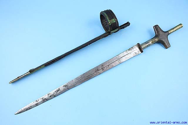 One of the many Variants of the Arm Dagger carried by the Tuareg also known as Telek . It is characterized by the cross shaped pommel. This specific one has a 17 inches blade. Wood handle with cross shaped grip and engraved brass and iron mounts. Colored tooled leather scabbard with classical Tuareg style chape. Leather arm band. Total length (in scabbard) 25 inches. Very good condition. Minor losses to the scabbard leather. |