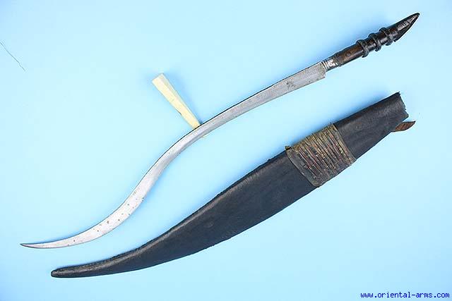The origin of this unusual and rare sword was in a fierce debates between collectors and researchers of blade weapons. It was attributed to the Caucasus, Kurdistan, North Africa, Turkey, Malaya as well as other origins. However, most probably it is coming from North / East Turkey and found in Caucasian areas as well. It is best known as Black Sea Yataghan or Laz Bichaq. It is characterized by the deeply re-curving blade and bifurcated pommel. This one has a 23 inches blade decorated with a typical punched dots design and dated to 126(?)1 (1845 in the Gregorian Calendar). The spione of the blade is finely chiseled. The grip is bound with leather ring. The pommel spikes are horn. Wood scabbard covered with leather. Total length 30 1/2 inches. Very good condition. Minor battle scars on the blade. Part of the scabbard leather cover is a new replacement. |