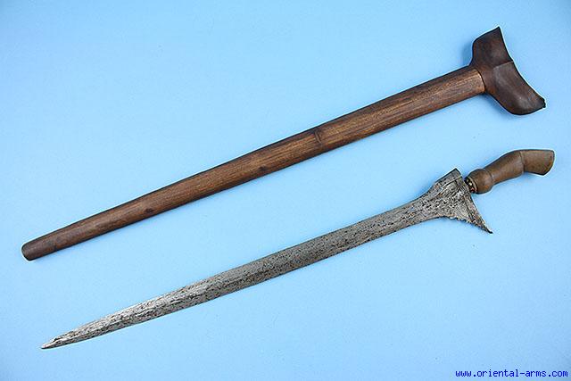 A Keris Penjang , also sometimes referred to as Execution Keris from Sumatra, late 19C. Massive pamor blade of diamond cross section 20 inches long. The hilt is wood. Brass mendak. Wood scabbard. Total length 29 inches. Very good condition. Lightly Chiped scabbard top. Low price |
