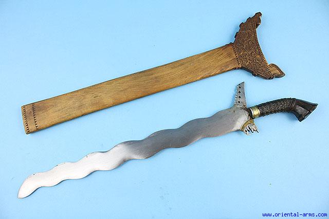 Up for sale is this Moro Kris sword , mid - late 20C. Wavy blade, deadly sharp, 19 inches long. No separate Ganja. Wood handle bound with metal wire. Brass clamp (Baca Baca, one missing). Wood scabbard bound with carved top. Total length (in scabbard) 25 1/2 inches. Very good condition. |