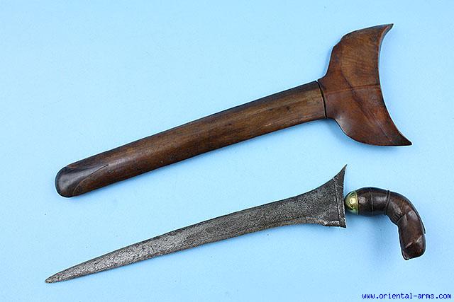 This very good Bugis Keris Dagger has an old straight pamor blade 12 inches long. The mendak is brass. Classical Bugis hilt and the scabbard carved from grained wood. Total Length 17 inches. Very good condition. Blade late 19C. Mounts early 20C.