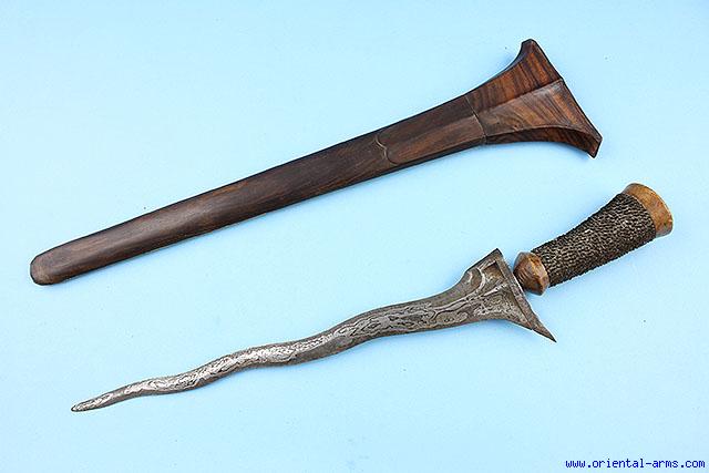 This Keris dagger is coming from Bali, Indonesia, early 20C. Wavy blade 14 1/2 inches long, good polished pamor structure. Wood handle bound with fibers. Wood scabbard . Fine dark wood front face and wrangka.. Light colored wood back side. . Total length 24 inches. Very good condition. |