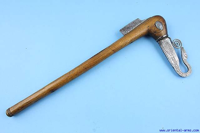 Up for sale is this Royal Scepter also known as Makpo, coming from the Republic of Benin, a symbol of authority and command. Wood handle with steel head in the shape of an animal, a snake in this case. 18 inches long. Very good plus condition. A scarce item. Late 19 - early 20C. |