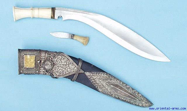 We offer for sale this superb regimental Kothimora Khukuri dagger,. late 19th C. of very good quality. It has a heavy down curving blade of 12 inches long and beautifully forged. The hilt is bone with brass bolster. The scabbard is wood covered with black leather, mounted with beautifully chased silver locket with gold panel on red fabric background and embossed silver chape. The compartment for the two by-knives is whole leather and it is intact but only the Karda (steel) is there. The other knife is missing. Total length 17 ½ inches. Very good condition. A crack in the bone grip (but it is still very solid) and the pommel bone plate is fixed with two later metal screws. Scabbard seams partially open. |