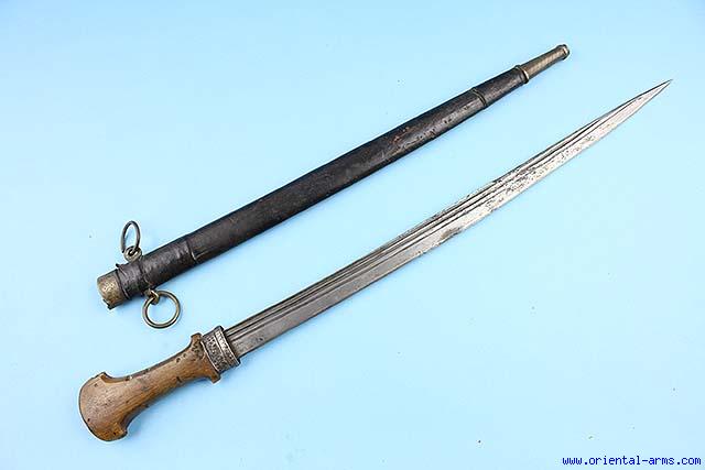 The Genoui, is a rare variant of the classical Moroccan ‘Koumaya’ curved dagger with straight blade. The name literally means from Genoa, probably to indicate its ancient source. This one is a very long exemplar with a straight 21 inches fullered blade is cut from an old sword and fitted with a massive Rhino horn handle. The scabbard is wood covered with leather and mounted with brass mounts. Total length 27 inches. Very good condition. Very lightly pitted spots on the blade. Good age patina on the horn handle but the pommel brass mount is lost .Minor bugs bites on the horn. |