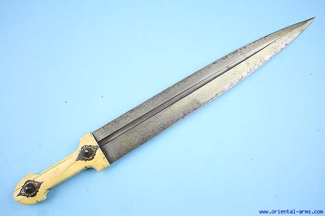 This Qama Dagger / Short Sword is Georgian or persian late 19c. Very well forged massive blade 14 1/2 inches long, with central off set fullers and gold koftgari work.Ivory grips with steel rosettes with gold inlay decoration. Total length 19 1/2 inches. Good condition. Old cracks to the handle.