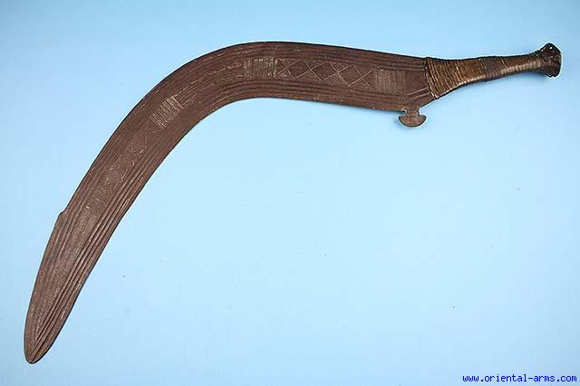 A real monster, 30 inches long, next to 5 inches wide Benge sickle shaped sword. Nicely fullered and engraved blade with good age patina. Handle bound with copper / steel strips. Early 20C. Very impressive sword.