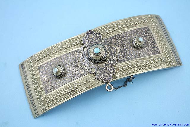 This very fine buckle is Caucasian, late 19 C., for use with belts carrying the weapons, Pistols as well as Swords / Daggers. Finely nielloed silver set with turquoise stones. Length 9 inches width 3 1/2 inches. Very good condition. A fine exemplar of Caucasian niello work.. |