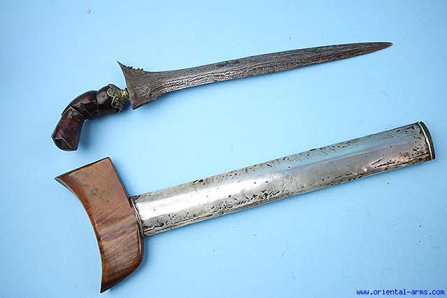 This very good Bugis Keris Dagger is earely 20C. with a massive blade 11 1/2 inches long, with clear nice pamor structure. The mendak is brass. The hilt and is carved from a beautifully grained wood and the scabbard is covered with silver. Total Length 17 inches. Very good condition. |