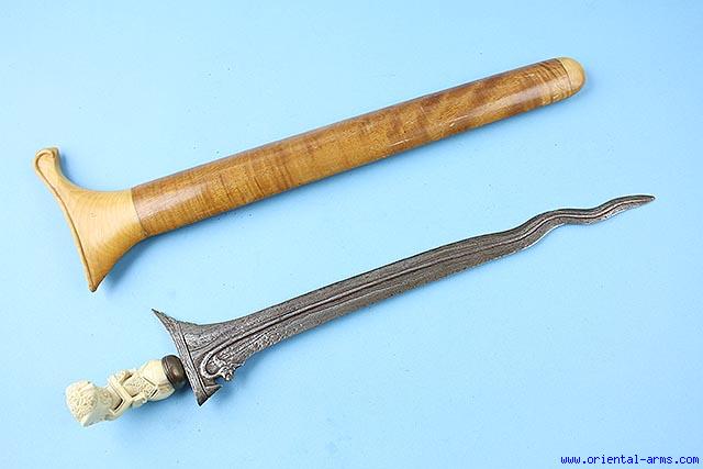 Here we offer a very rare Keris from Sumatra, with unusual and rare Naga style blade 14 inches long. Beautifully carved ivory handle with a rarther late wood scabbard. Total length 18 inches. The handle is late 19c and the blade probabbly 18th. Very good condition. A rare and fine item.