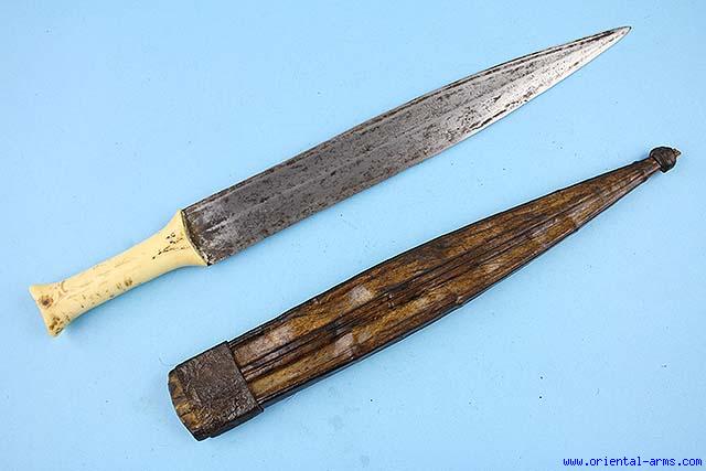 This old dagger, early 20C. is mopst probably coming from East Africa. The blade shape as well as the scabbard structure reminding East African Daggers. However it is longer than most similar daggers. 11 inches long blade, well forged with a shallow central rib. I shaped ivory grip, plain. Well made hide / leather scabbard. Total length 16 inches. Very good condition. |