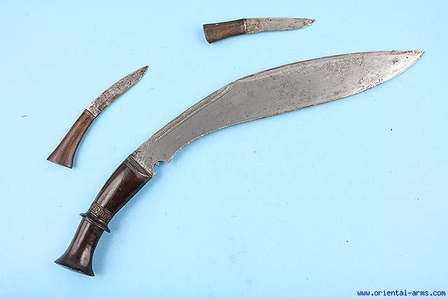 Up for sale is this very good Khukuri knife, late 19C. Massive 12 inches blade with fullered spine and "eyelashes" mark of quality. Carved wood handle. Total length 15 inches. This Khukuri comes with two accompanied small knives. Newly made scabbard from heavy fabric ( Not shown) |