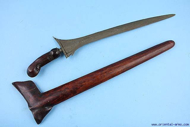 This java keris has a straight 12 inches blade with unusual pamor structure. Wood scabbard carved from a single piece of wood. Classical shape handle. Total length 18 inches. Very good condition.