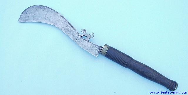 This chopper / Machete is of Indian origin, late 19 C. The heavy blade is 12 inches long, mounted with a 10 inches turned wood handle, The spine of the blade is beautifully filed and a image of a standing lion (?) is filed on top of the spine. Very good condition. |
