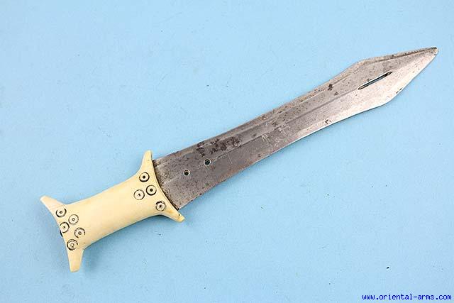This old dagger, early 20C. is most probably coming from East Africa. 7 1/2 inches blade, well forged, nicely pierced and with a shallow central rib. I shaped ivory grip with engraved black painted circles. Total length 10 inches. Very good condition. No scabbard. |