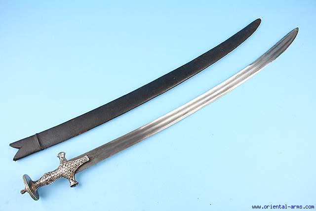 From India, probably late 18 – early 19 C, comes this heavy fighting Tulwar sword. The curved and nicely fullered blade is 31 1/2 inches long, 9 inches false edge and very well balanced. The steel handle is of classical form with silver decoration. Original leather covered scabbard. Total length 36 inches. Very good condition. Min or losses to the silver work on the handle. A real and efficient fighting sword. |