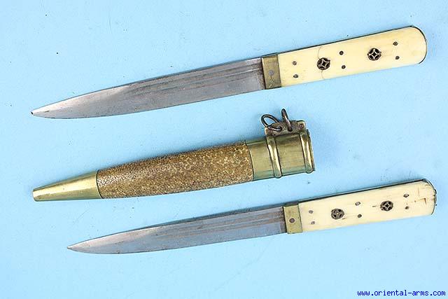 From our private collection, a fine double knife in one scabbard, China, late 19 C. Fine fullered blades 5 1/2 inches long (with traces of etched inscription). Bone grips with brass bolsters. Scabbard covered with ray skin and mounted with brass locket and chape, Total length 10 inches. Very good condition. |
