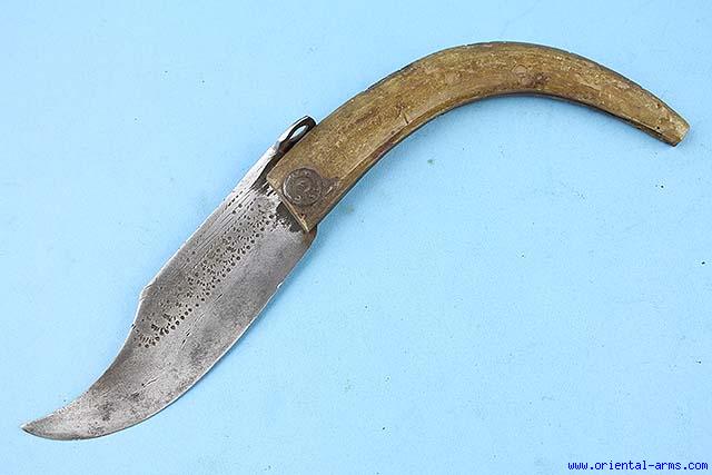 This folding knife is most probably European, Mediterranean or Middle Eastern Early 20C. Heavy wide blade 5 inches long with a deep clipped tip. Punched decoration on the blade. Curved horn handle. Total length 10 inches. Very good condition..