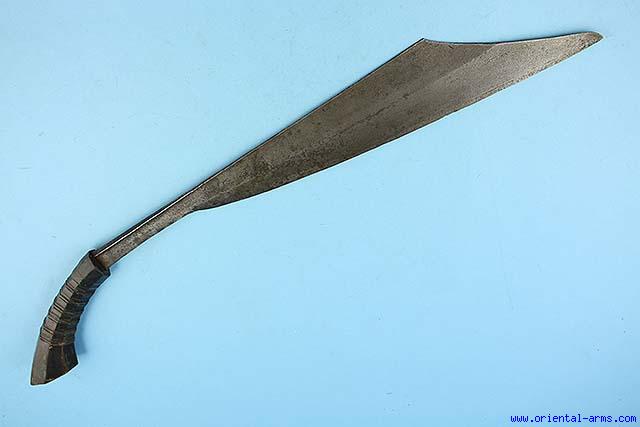 We offer for sale a rare sword from Sulawesi (Celebes) island. It is from the Klewang family but of a rare form. The blade is heavy with a ridged spine, 24 inches long with a 7 inches clipped tip. max width 3 1/2 near the tip. Horn handle. Total length 34 inches. Very good condition. Age cracke on the horn hilt. A rare find. |