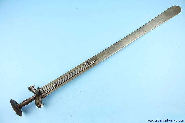 Up for sale is this fine Patissa sword, 17 C., with a 33inches blade forged of very fine wootz (watered, Damascus) steel. The blade is widening to its maximum width of 2 inches just above the tip, which is rounded in a spatula shape. Old Indian style classical whole steel handle. Total length 38inches. Very good condition to age. A fine rare sword. |