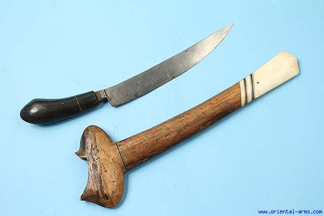 The Siraui is a rare dagger from Sumatra, with a heavy short and curved blade sharpened on its convex edge. In this exemplar the blade is 7 inches long. The handle is carved from horn. The scabbard is wood with bone tip. Total length 15 inches. Very good condition. |
