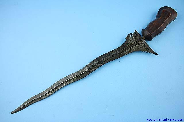 This fine Keris sword is coming from Bali, late 19 C. Finely forged pamor blade with a pronounced central rib and of polished black and white pattern steel, 18 inches long. Wood handle of classical form. Total length 23 inches. Very good condition. No mendak. From an old private European collection. |