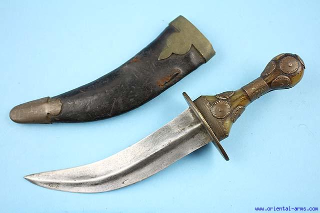 Up for sale is this Jambiya, of a group usually referred to as Indo-Arab. Made in India for the Arab market or made in Arabia with Indian style. Massive curved blade with strong central rib 7 inches long. Horn handle set with many brass discs imitating old coins. Heavy brass cross guard (usually not found on similar items). Leather covered scabbard with brass mounts. Total length 12 inches. Very good condition. Early 20C. item |