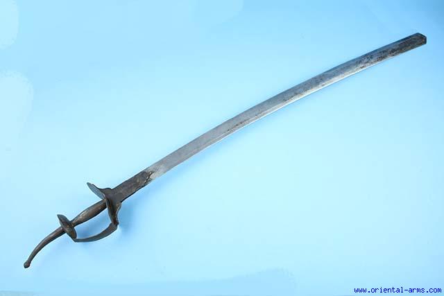 Not Exactly a Khanda nor a Firangi , but definitly large heavy and Unusual sword. Long heavy down curving blade, 37 inches long with a 13 inches back edge and triangular shaped tip. Long basket hilt with a 4 inches pommel spike. 45 inches total length. Very good condition. India, probably central India, early 19C. or earlier. An impressive sword. |