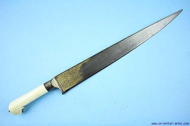 Up for sale is this fine short Khyber sword, massive blade, 15 1/2 inches long with a strong T Spine and fine gold inlay (Koftgari) decoration. The blade is forged from high quality wootz (Watered, Damascus) steel of clear high contrast pattern. Large ivory grips with steel bolsters and grip strap, also inlaid with gold (with some losses). Total length 21 inches. Very good condition. No scabbard. |