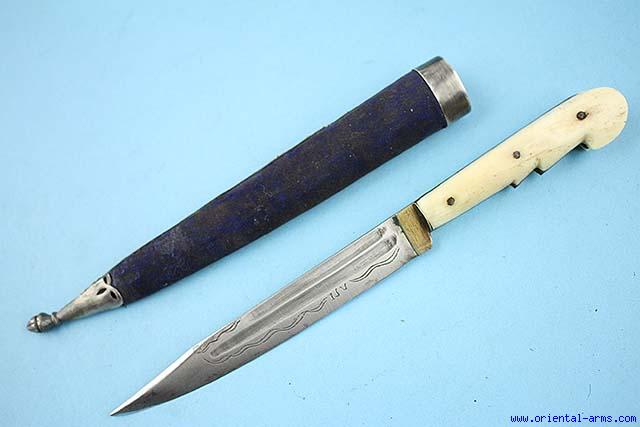 This knife is coming from Trabazon area, on the shores of the Black Sea, north Turkey. Early 20 C. 6 inches fullered blade with clipped spine. Bone grips and brass bolsters. Later fabric covered scabbard with silver mounts. Total length 11 inches. Very good condition. |