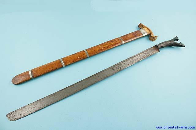 A Sikin, one of the many variations of the Klewang, the Indonesian machete like sword. This one is Acheen from Sumatra, mid 19th C. The blade is straight and single edge 24 1/2 inches long. The steel bolster is forged in a polygonal shape. The hilt is carved of horn in a typical forked pommel and beautifully carved with geometrical design. The scabbard is made of light color hardwood. The scabbard mouth is beautifully carved from a Ivory piece. The scabbard is bound with silver (?) bands. Total length is 30 1/2 inches. Very good condition. Minor blackend spots to the blade. |