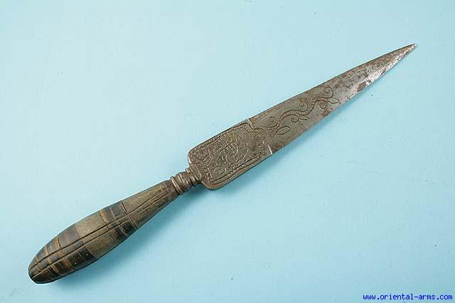 Up for sale a nice dagger from soutern Italy. Doubled edged engraved blade 7 1/2 inches long. Handle made from horn sectors in different colors. Total length 12 inches lomg. Late 18-Early 19C. good condition.