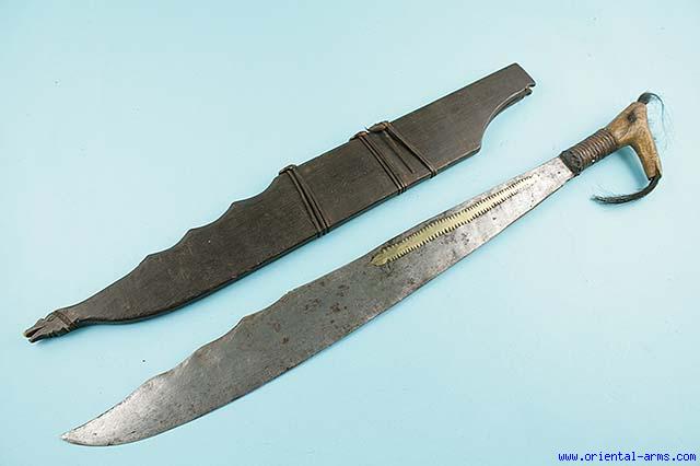 A very unuual Mandau style sword from Borneo. We have never seen a simillar sword before. Massive blade 21 inches long wavey spine toward the tip with snake style brass insert. Primitive bone/ antler Mandau style handle with tufts of black hair bundles and rattan bounded grip. wood scabbard.Total length 28 inches. Very good condition. Late 19c. |