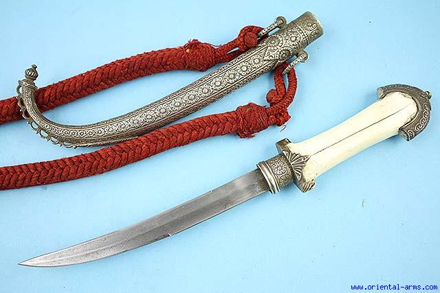 Up for sale is this fine example of a Moroccan Koumaya dagger, circa 1900. 8 inches finely fullered blade. Bone handle. Very finely chiseled heavy silver handle mounts and scabbard with chiseled carrying rings. Original red silk baldric belt. Total length 16 inches. Very good condition. Age crack on the bone handle but holds very solid. |