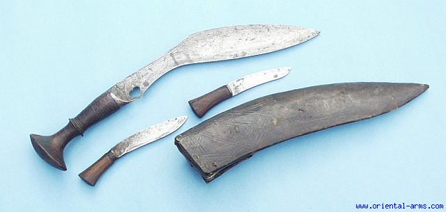 The KHUKURI is the traditional weapon of the Gurkha people from NEPAL. It is an every day tool used for hunting, agriculture, defense and fighting, and every man in Nepal is proud to carry one for use and as a symbol of status. It derives its shape from the “KOPIS” the ancient Greek sword. This specific example is from Early 20th C. It has a blade of 9 ˝ inches long, deeply down curving, with a very unusual closed Choi at the blade base. The hilt is wood with a very wide flared pommel. The scabbard is wood covered with leather, with a compartment for the two by-knives complete with wood grips. Total length 15 inches. Good condition. Some darkening spots on the blade and worn and re-sewed scabbard. Very attractive price , a bergain for this quality. |