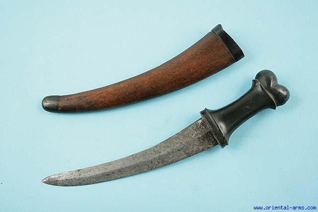 This rare Indonesian dagger in the style of an Arab Jambiya is also known as and found in Sumatra and Mentawi islands. This is a small exemplar with a 5 inches curved blade forged from pamor steel. The handle is black horn with lobbed pommel. The wood scabbard is mounted with horn mouth and tip. Total length 8 1/2 inches. Very good condition. |
