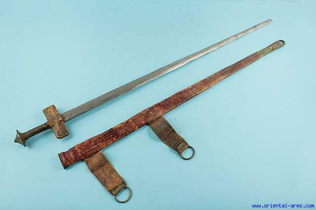 This good Takouba the sword of the Tuareg people is a late 19 C. sword, with a double edge 32 inches engraved blade. The hilt is of the classical Takouba design made of steel and covered with leather. The scabbard is tooled leather. Total length 37 inches. Good condition.