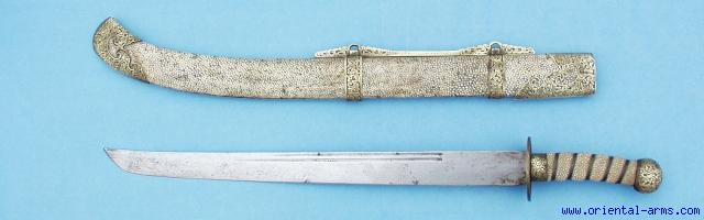 A very nice Chinese Dao short sword of the Ching Dynasty, probably late 19th century. The slightly curved blade is 19 inches long with a short 4 inches back edge and two narrow fullers. The grip is covered with white (natural color) ‘Sting Ray’ skin and bound with a spiral brass strip. The Pommel and the disk cross guard are cast and engraved brass. The scabbard is wood also covered with ‘Sting Ray’ skin and mounted with beautifully engraved brass fittings. Excellent example of a typical ‘Dao’ sword of the last Chinese Dynasty. Very good plus condition. All parts are old and original to this sword. No added or replaced parts.at attractive |