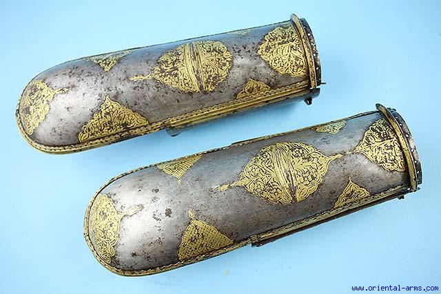Up for sale this very nice pair hand armor Bazu-Bands. 12 inches long steel richly decorated with gold koftgari work. Good condition. Late 18c early 19,