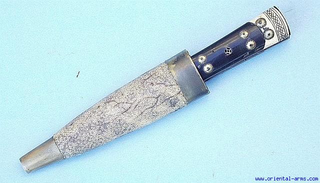 The double blades set in one scabbard is known in the Chinese weaponry. It is also practiced in knives and daggers. We offer here for sale a lat 19 C. set of two fighting knives housed in one scabbard. Each blade is very heavy, leaf shaped6 inches long with a 3 inch false edge. Two fullers on the outer face and one fuller on the inner face. Horn grips (One light color and one black) both with engraved bone pommels and decorated brass rivets rosettes. Wood scabbard covered with ray skin. Very good condition. Very minor pitted spots and few old cracks in the horn. |