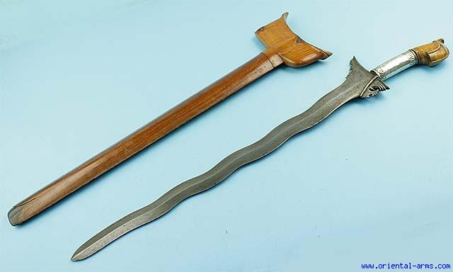 This kris sword is most probably Malay, late 19C. The blade is laminated 22 inches long. silver clamps (Baka - Baka). Chased silver grip and very nice wood Cockatoo pommel. Beautiful scabbard with floral carving, and horn tip. Old collection #. Total length 31 inches. a rare Kris. |