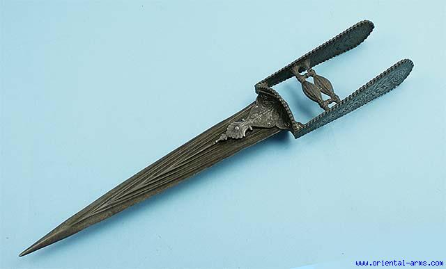 A nice Indian Katar dagger with 12 inches triangular blade , multiple fullers , the base of the blade enclosed by ornate flanges. Spatulate side bars wit beaded edges. A nice early item.